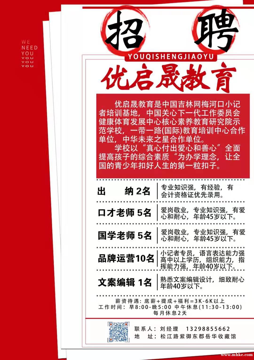 優(yōu)啟晟教育招聘 優(yōu)啟晟教育是中國吉林網(wǎng)梅河口小記者培訓(xùn)基地,中國關(guān)心下一代工作委員會健康體育發(fā)展中心核心素養(yǎng)教育研究院示范學(xué)校,一帶一路(國際)教育培訓(xùn)中心合作單位,中華未來之星合作單位。 學(xué)校以“真心付出愛心和善心”全面提高孩子的綜合素質(zhì)“為辦學(xué)理念,讓全國的青少年扣好人生的第一??圩?按現(xiàn)階段公司發(fā)展需要招聘以下人員??诓爬蠋?名: 愛崗敬業(yè),專業(yè)知識強(qiáng),有愛心和耐心,年齡45歲以下。國學(xué)老師5名: 愛崗敬業(yè),專業(yè)知識強(qiáng),有愛心和耐心,年齡45歲以下。品牌運營5名: 小記者專員,語言表達(dá)能力強(qiáng),高以上學(xué)歷,組織指揮能力強(qiáng), 40歲以下。文案編輯1名: 熟悉文案編輯設(shè)計,細(xì)致耐心年齡40歲以下。薪資待遇:底薪+提成+福利=3k-6k以上工作時間:早8:00-晚5:00 中午休息(11:30-13:00)每月休息2天聯(lián) 系 人:劉經(jīng)理 電 話:13298855662地 址:松江路紫御東郡岳華收藏館 聯(lián)系我時,請說是在梅小網(wǎng)看到的,謝謝!